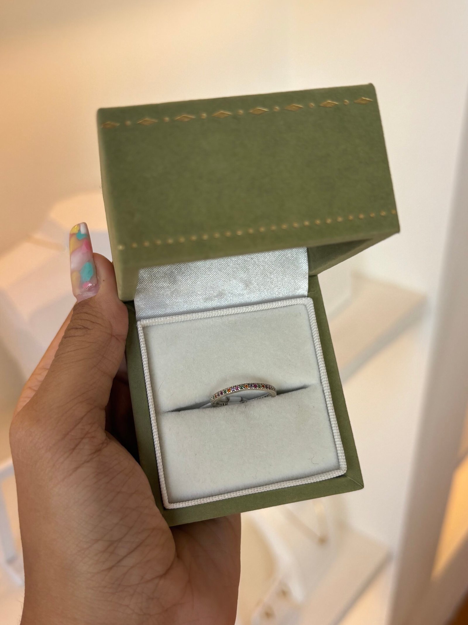 Toda a vibração do arco-íris em um brilho sutil. Este anel em Prata 925 é uma meia aliança cravejada com zircônias coloridas, criando um degradê vibrante e elegante. Uma joia versátil, perfeita para adicionar vida ao seu mix de anéis ou para ser usada como um aparador moderno que ilumina sua aliança com um toque de cor e alegria.