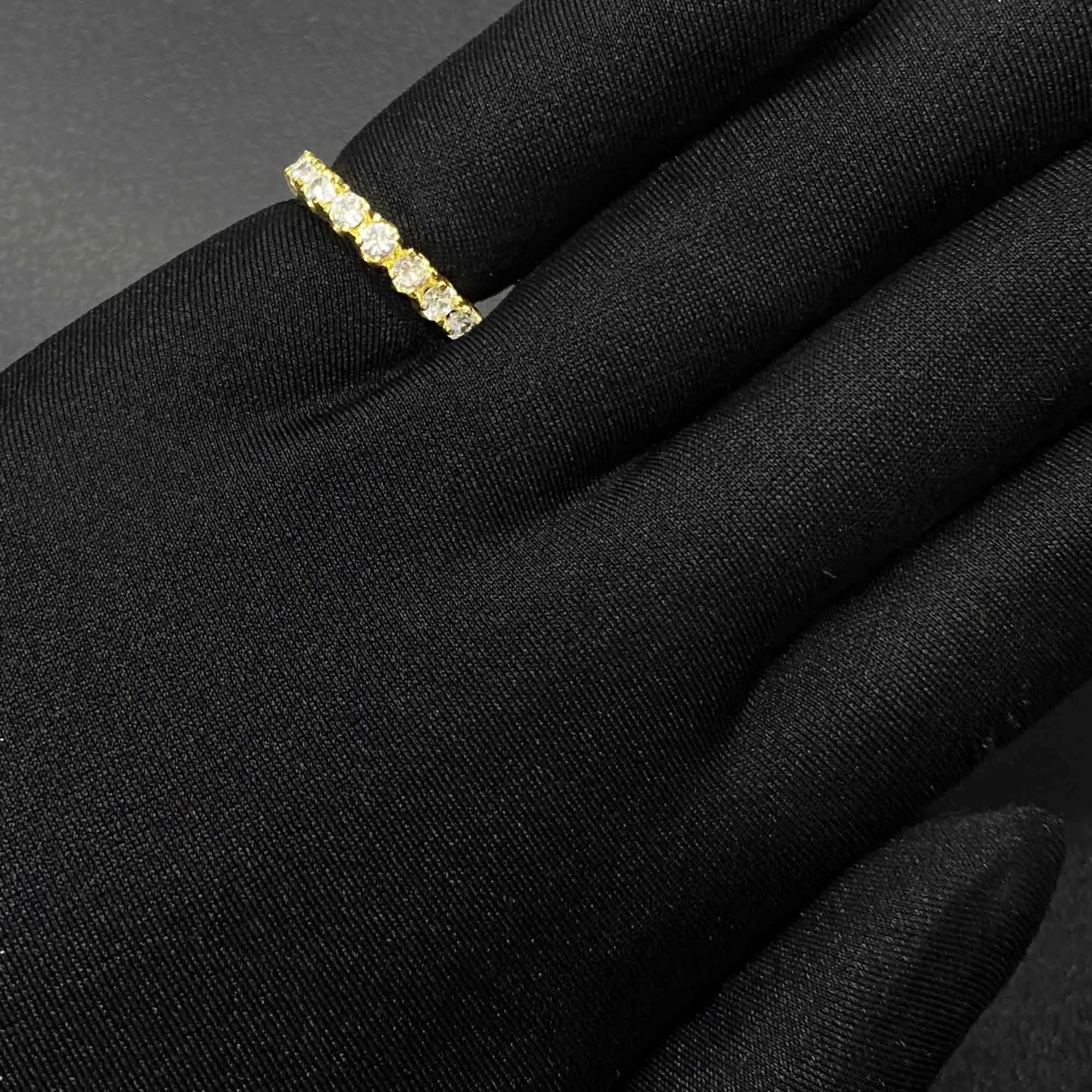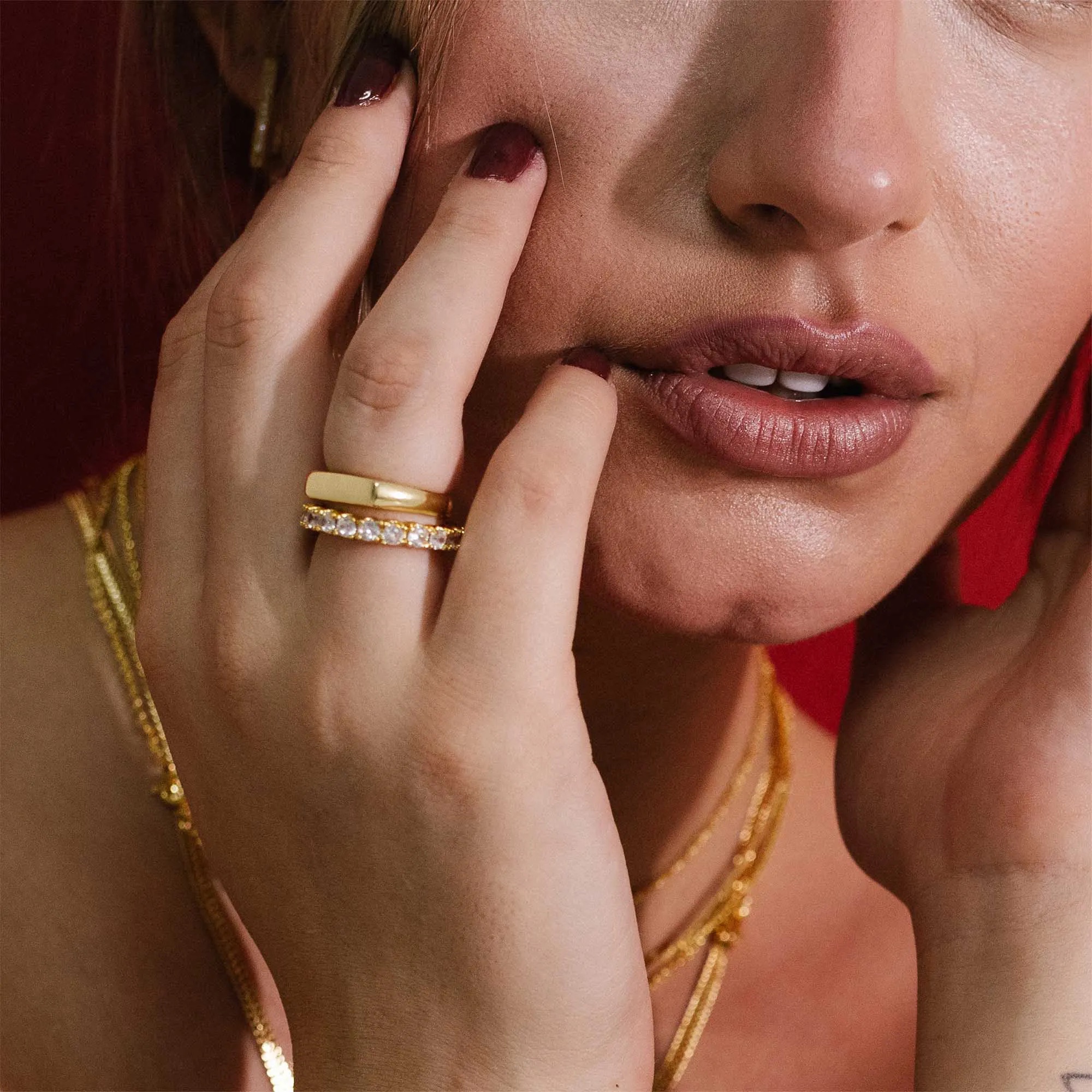 O Anel Eternité é a expressão perfeita de luxo e brilho. Com cravação completa de pedras ao redor de toda a peça, seu design simboliza a eternidade e a continuidade do amor e da elegância. Uma joia ideal para marcar momentos especiais ou elevar qualquer look com sofisticação.