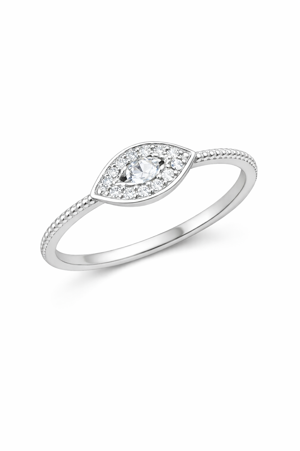 Anel delicado em Prata 925 com zircônia marquise central e micro-pontilhado lateral — acabamento polido e design minimalista.
