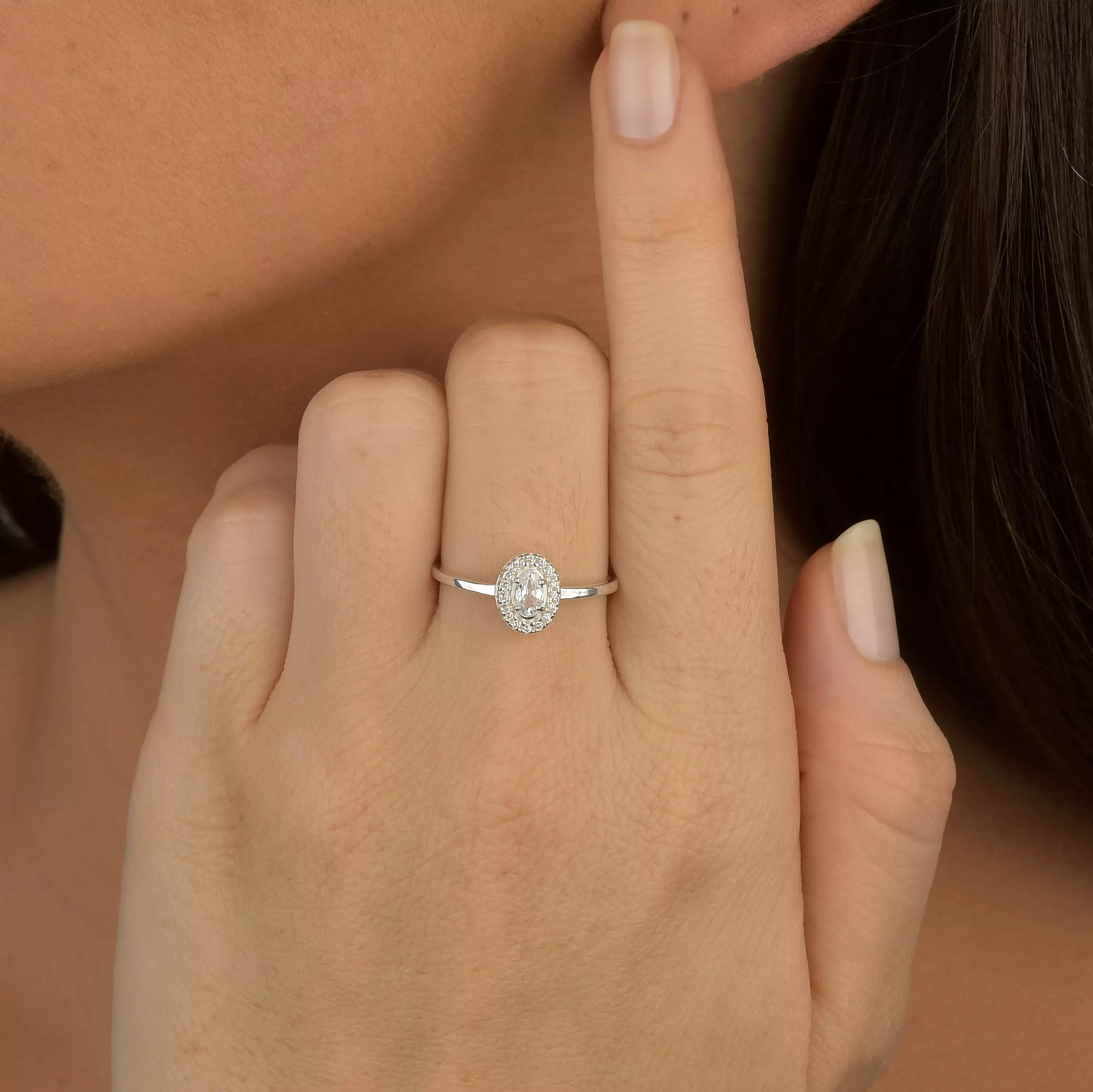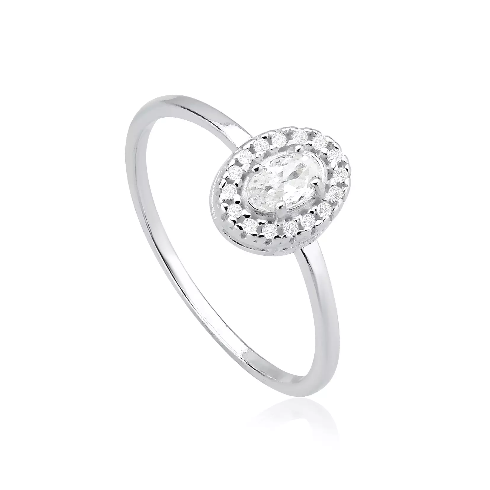 Anel em Prata 925 com zircônia central oval e halo cravejado, elegante e atemporal.