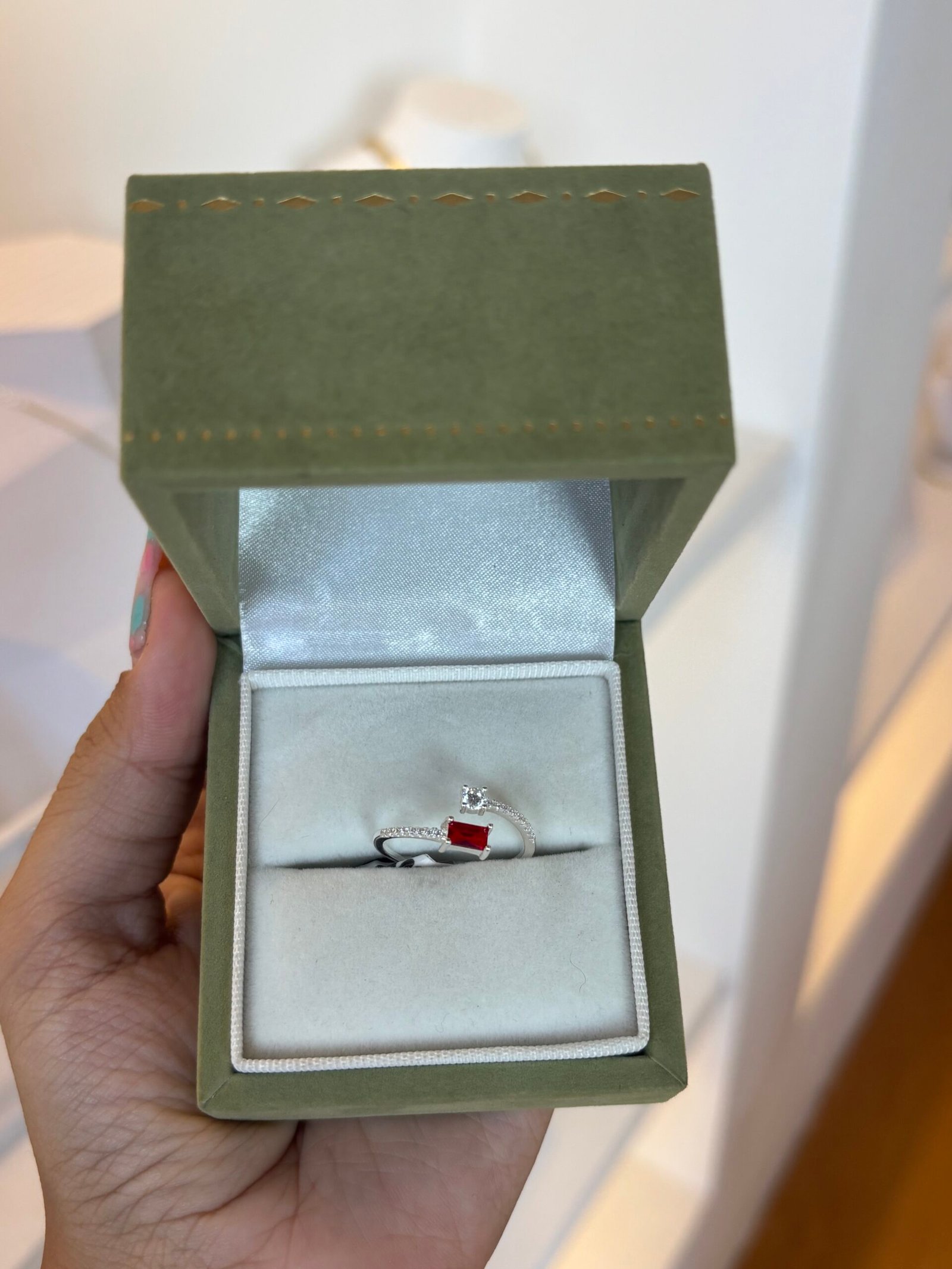 O Anel Solitário Retangular Vermelho da Alvarenga Joias é uma declaração de estilo. Confeccionado em Prata 925 legítima, o destaque central é a pedra em tom vermelho vibrante, cuja lapidação retangular (estilo baguete) oferece um brilho sofisticado e um visual arquitetônico muito atual.