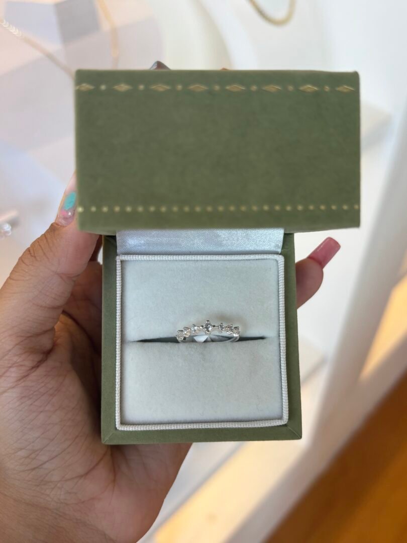 A delicadeza em sua forma mais alongada e brilhante. Este anel em Prata 925 destaca uma zircônia central em lapidação navete (marquise), emoldurada por duas pequenas zircônias laterais e um aro trabalhado em delicadas bolinhas. Uma joia de design romântico e refinado, perfeita para alongar visualmente os dedos e adicionar um toque de sofisticação artesanal ao seu mix de anéis.