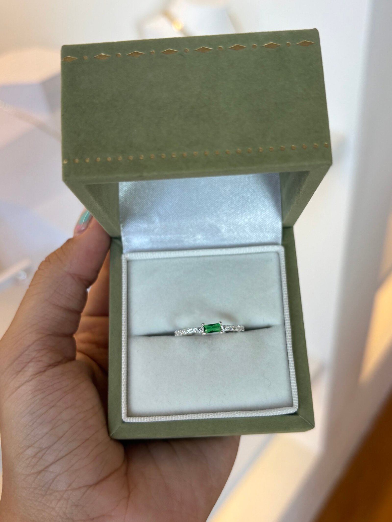 A nobreza do verde em linhas modernas e precisas. Este anel em Prata 925 destaca uma zircônia central verde esmeralda em lapidação retangular, emoldurada por um aro delicadamente cravejado com microzircônias incolores. Uma joia que exala poder e sofisticação, perfeita para mulheres que buscam um ponto de cor marcante com o brilho refinado da alta joalheria.
