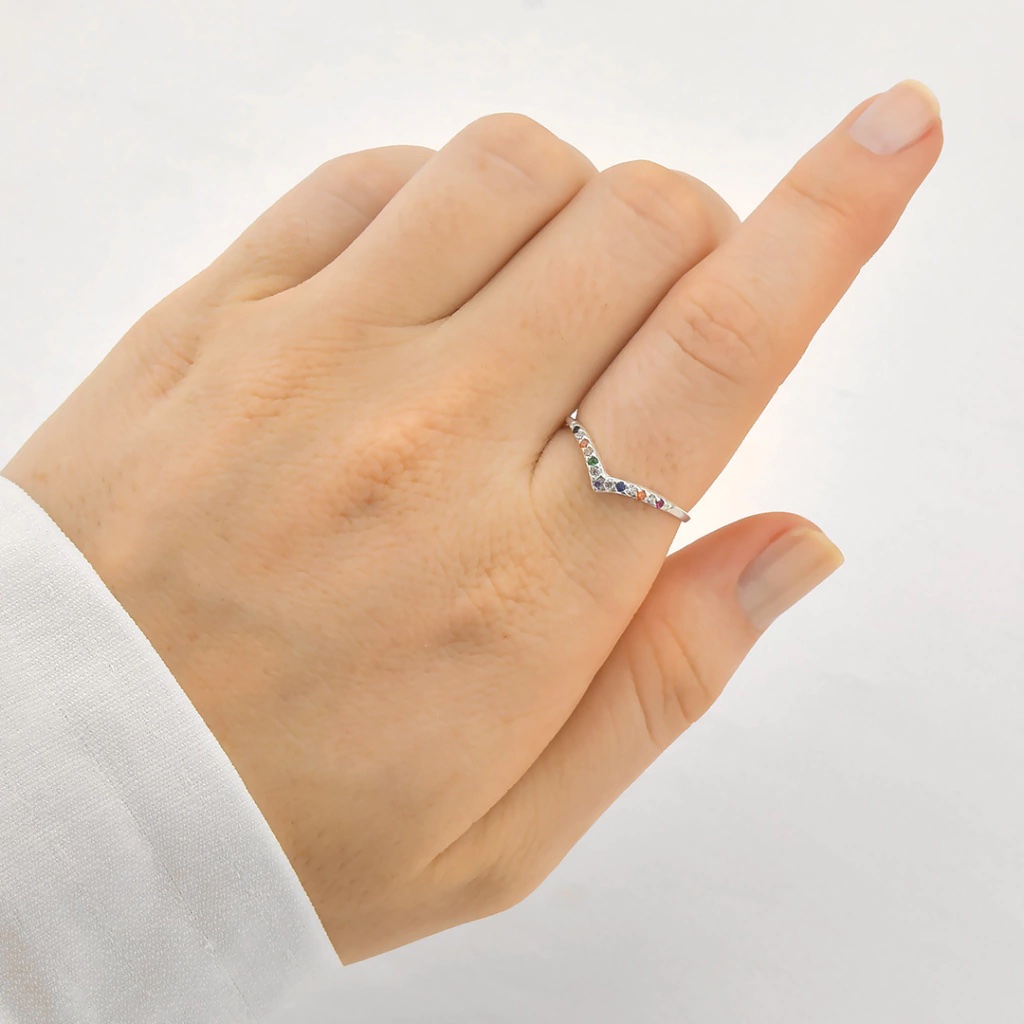 Adicione um toque moderno e um arco-íris de alegria ao seu estilo com este anel de prata em formato de “V” gracioso. Delicadamente cravejado com uma fileira de zircônias coloridas vibrantes, este anel é perfeito para expressar sua personalidade única. Seu design elegante permite que seja usado sozinho como um ponto de cor marcante ou empilhado com outros anéis para um mix deslumbrante. Uma peça versátil que celebra a beleza da cor e a modernidade das formas.