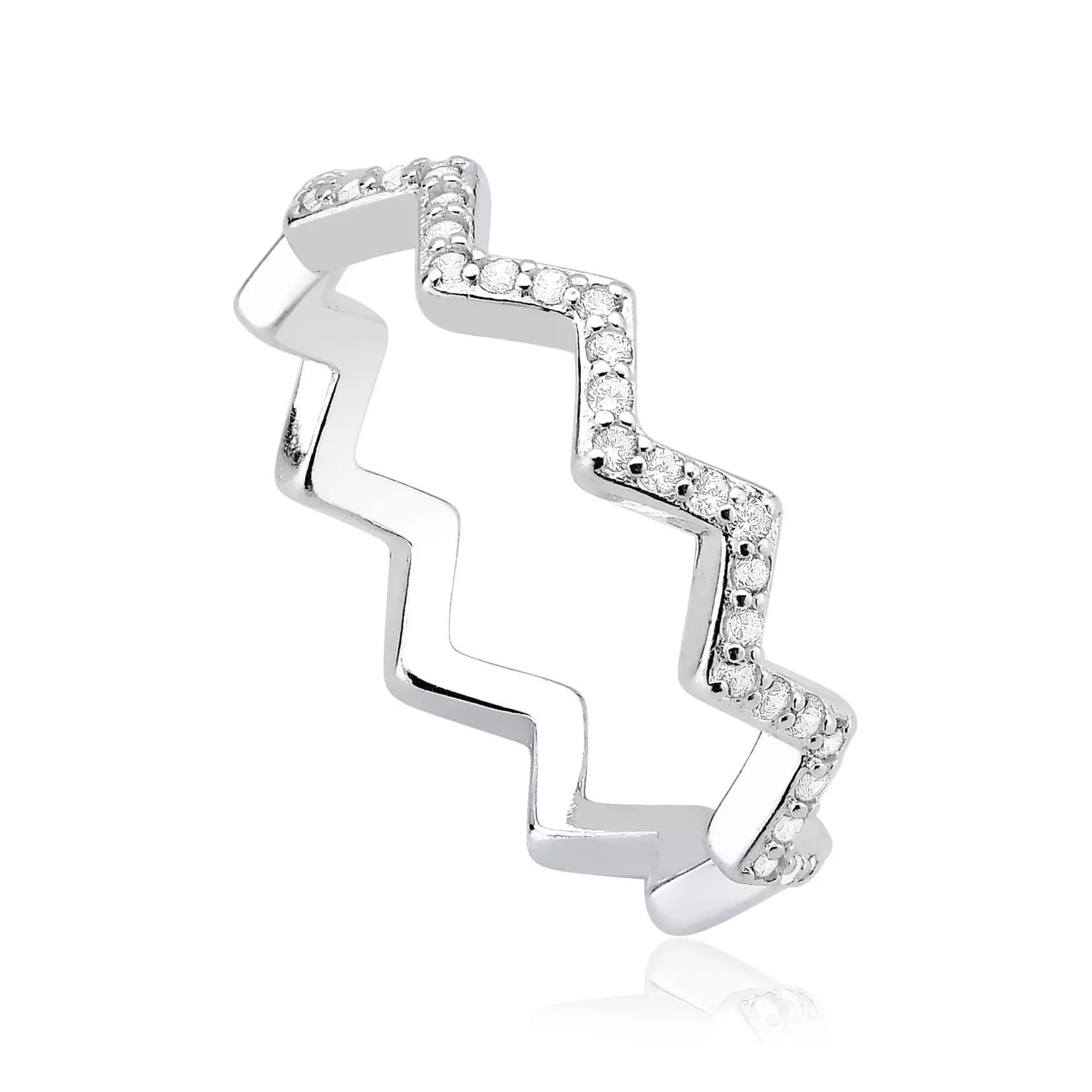 Anel prateado com design zig zag e zircônias cravejadas, moderno, delicado e cheio de brilho.