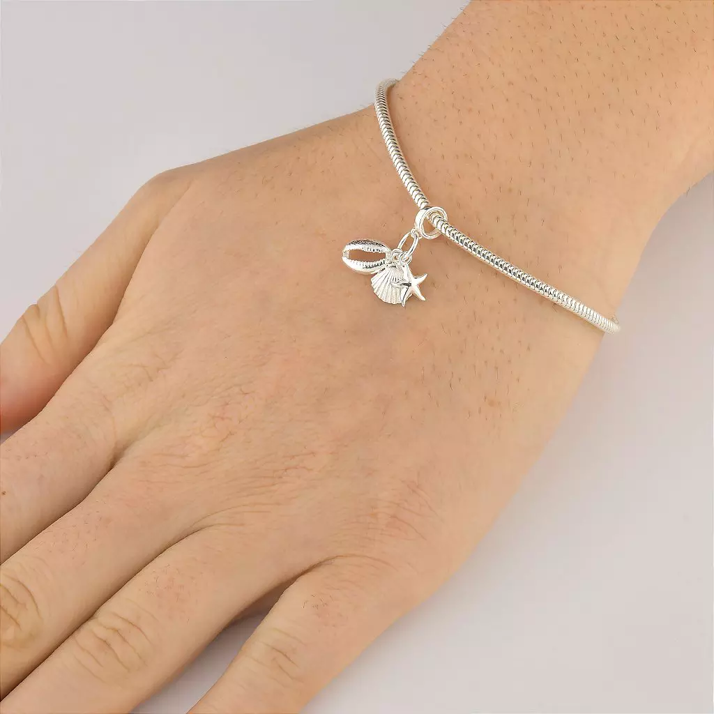 Berloque em Prata 925 com trio de símbolos do mar — búzio, concha e estrela-do-mar — delicado, simbólico e cheio de significado.