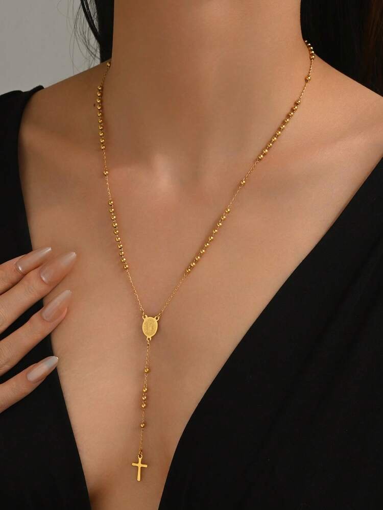 Colar terço em aço inoxidável, joia religiosa delicada, resistente e ideal para uso diário.