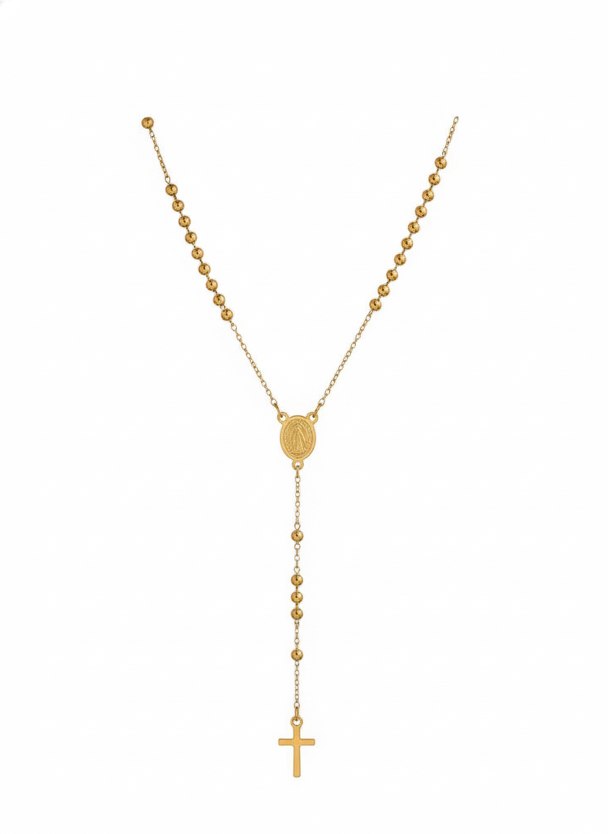 O colar terço em aço inoxidável é uma joia religiosa feminina que une fé, elegância e praticidade. Seu design estilo rosário conta com contas delicadas, medalha central e cruz pendente, criando um visual clássico e atemporal que combina com diferentes estilos.