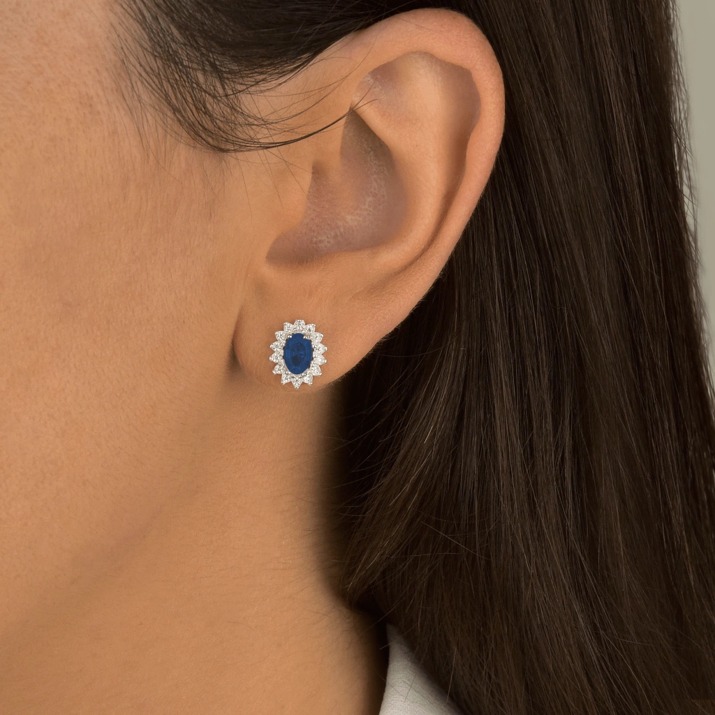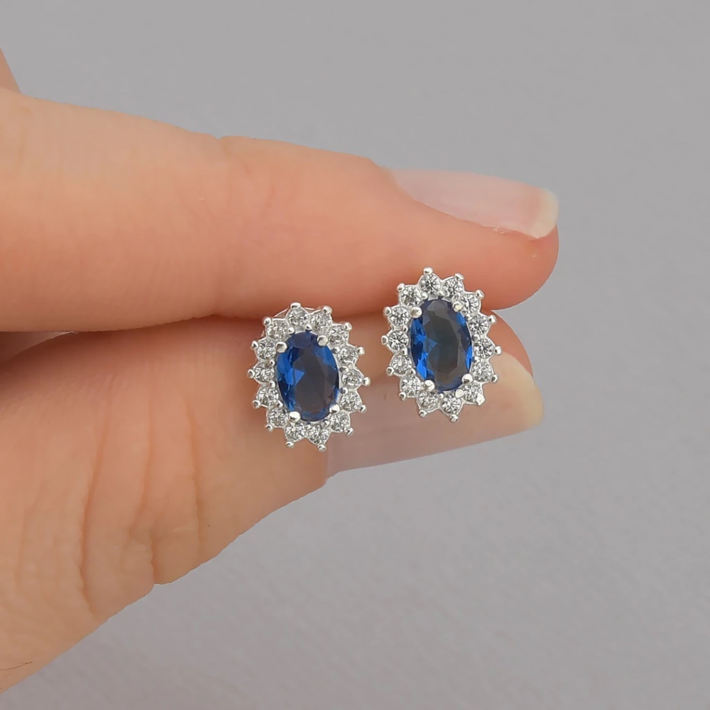 Deixe o encanto do céu noturno brilhar em você com estes elegantes brincos de prata. Apresentando uma deslumbrante pedra central oval na cor azul safira profunda, que evoca serenidade e sofisticação, cada brinco é realçado por um halo de zircônias cintilantes que amplificam seu brilho. Perfeitos para quem busca uma joia clássica com um toque de cor vibrante e significado, estes brincos são ideais para qualquer ocasião, do dia a dia a eventos especiais, adicionando um toque de luxo discreto e atemporal ao seu estilo.