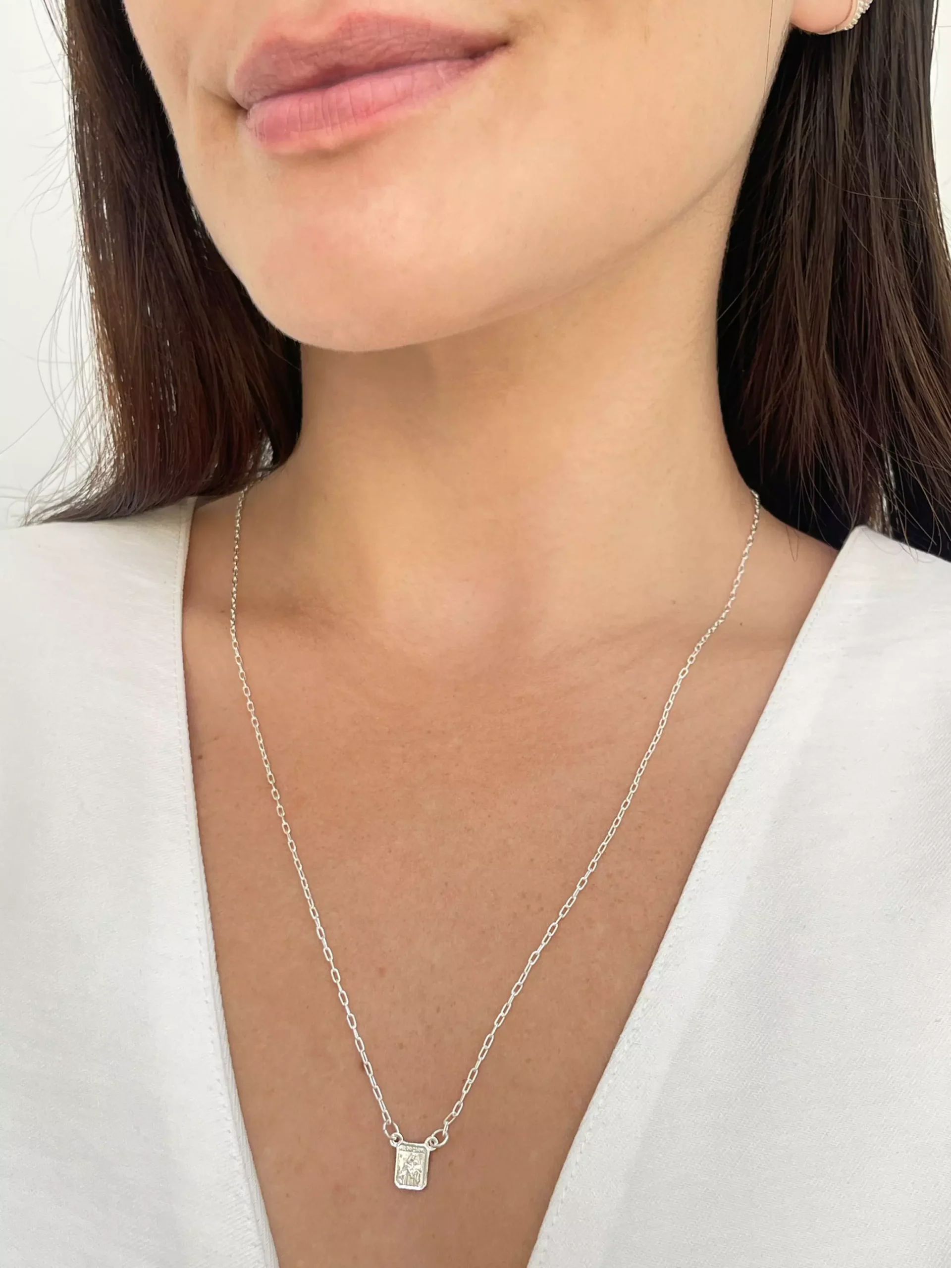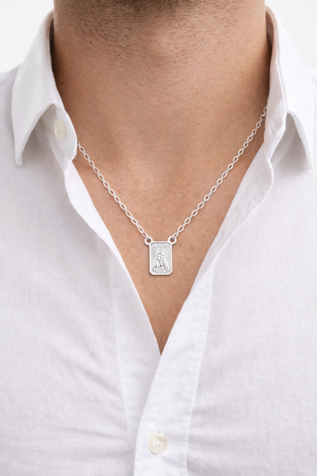 Escapulário em Prata 925 com duas medalhas retangulares minimalistas — design religioso e estilo layering pronto para o dia a dia.