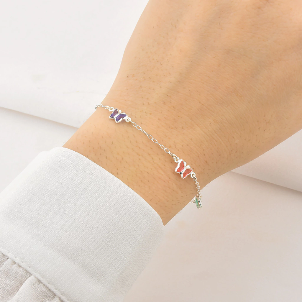 Pulseira em Prata 925 com borboletas coloridas, delicada, charmosa e perfeita para presentear.