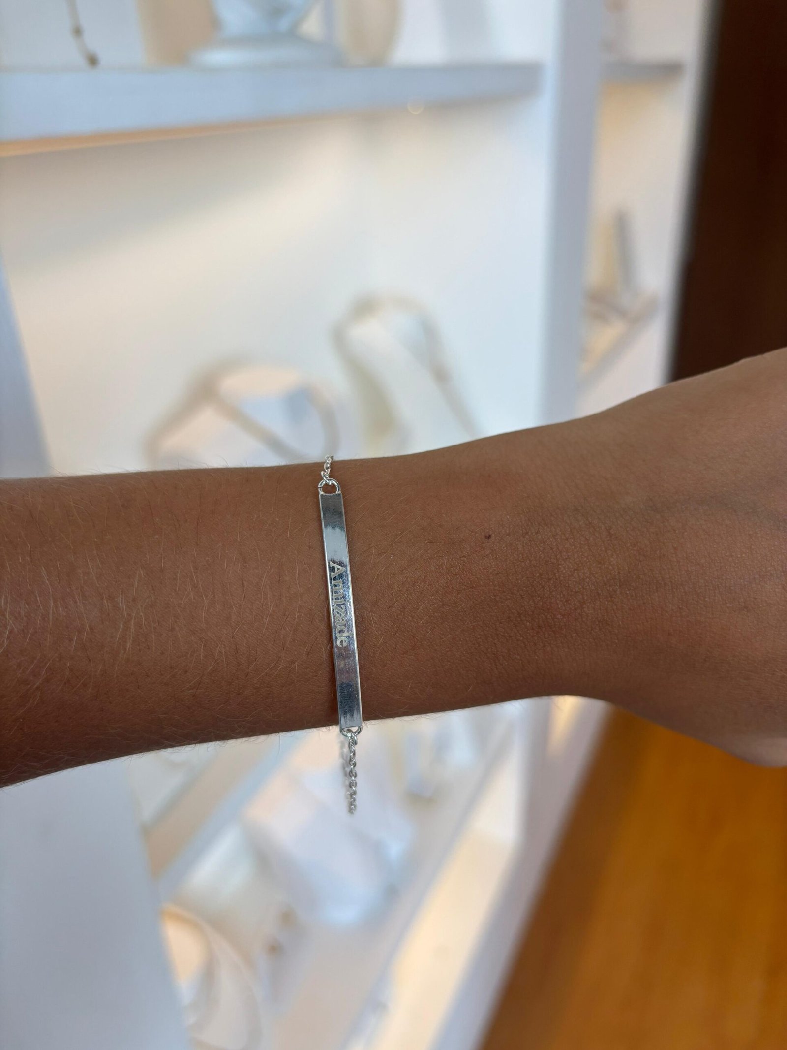 O laço que nos une. Esta pulseira em Prata 925 traz uma placa central com a palavra “Amizade” gravada com precisão. Uma peça minimalista e carregada de afeto, perfeita para presentear quem caminha ao seu lado ou para levar esse sentimento sempre com você.