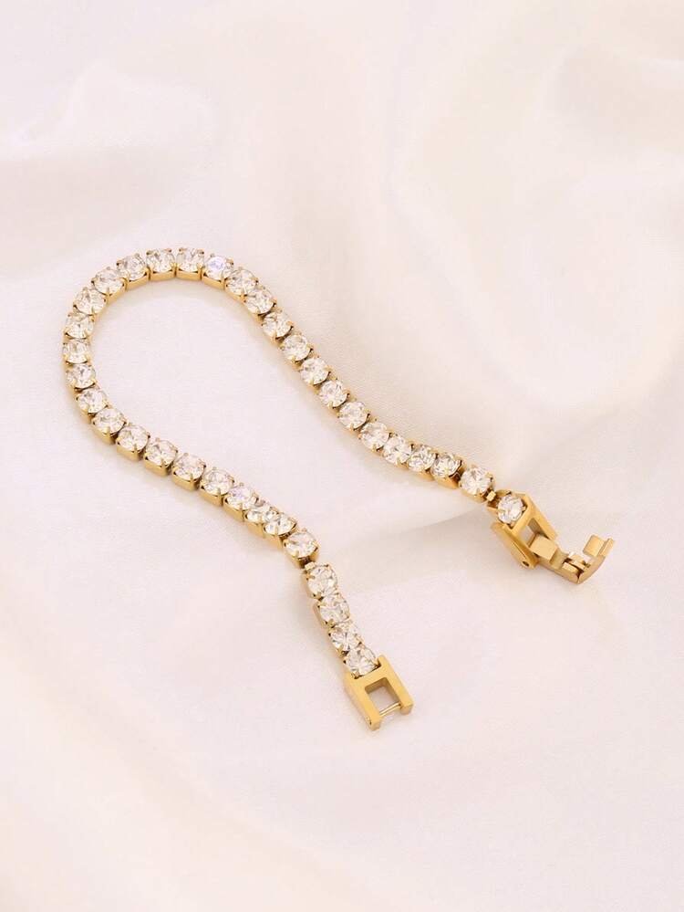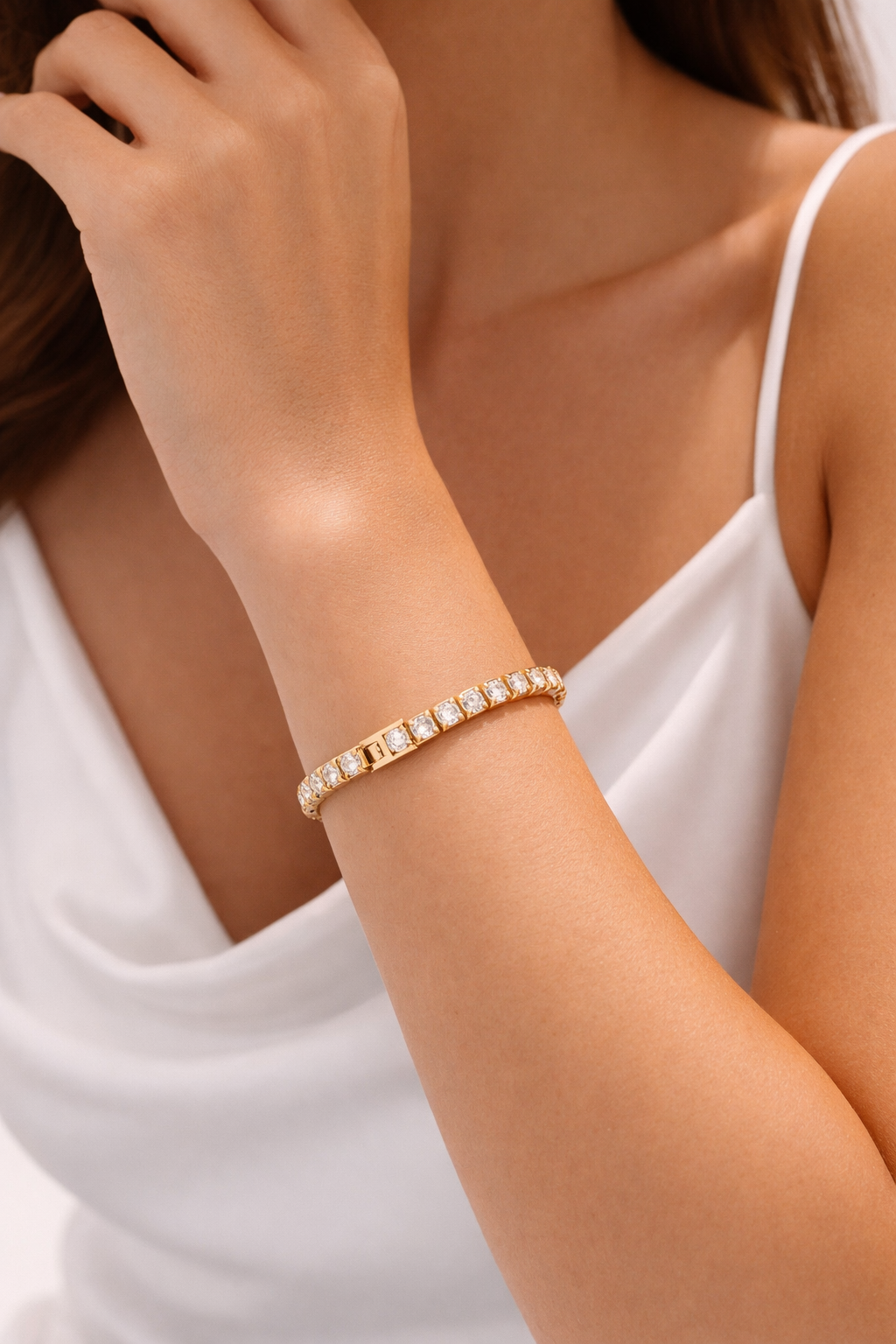 Pulseira riviera em aço inoxidável dourado com zircônias de alto brilho. Joia elegante, resistente e perfeita para presentear ou usar no dia a dia.