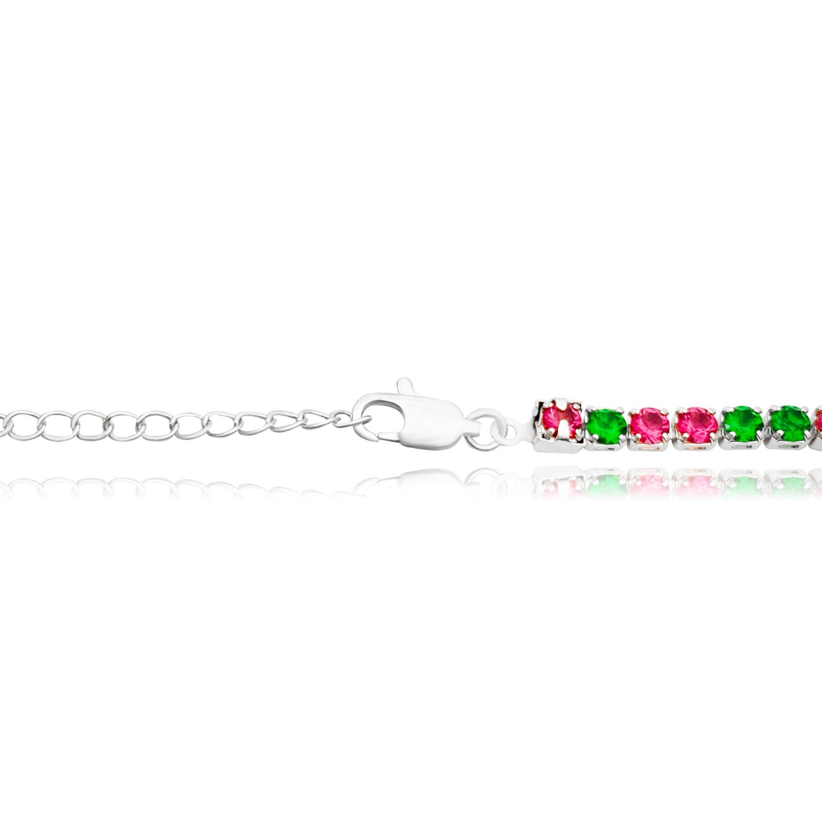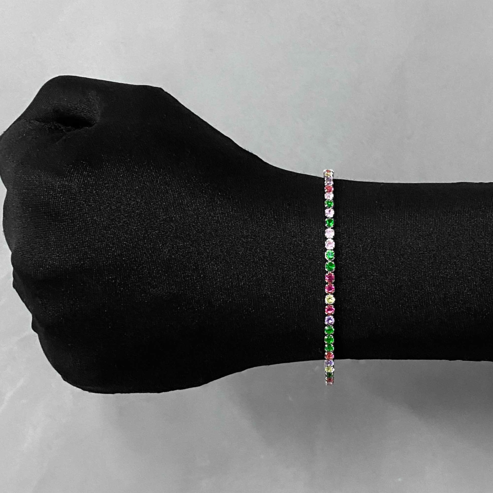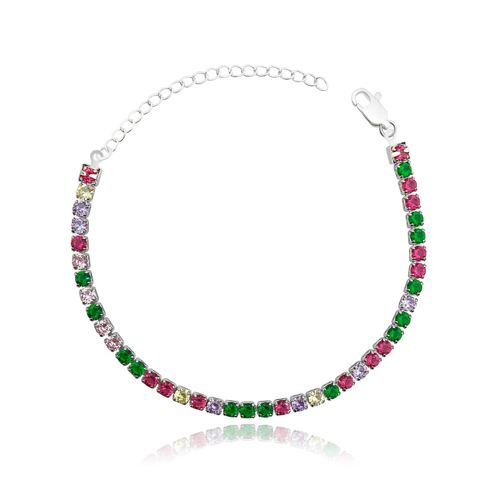 Deixe a alegria das cores envolver seu pulso com esta deslumbrante pulseira tennis de prata. Com um design clássico e elegante, ela é cravejada com uma sequência vibrante de zircônias em diversas tonalidades – verde esmeralda, rosa fúcsia, roxo ametista e amarelo claro – criando um verdadeiro arco-íris de brilho. Perfeita para adicionar um toque de glamour e personalidade ao seu dia a dia, para compor um mix de pulseiras ou para celebrar momentos especiais com um acessório que irradia felicidade e sofisticação. Uma joia versátil que combina a beleza atemporal com a vivacidade das cores.